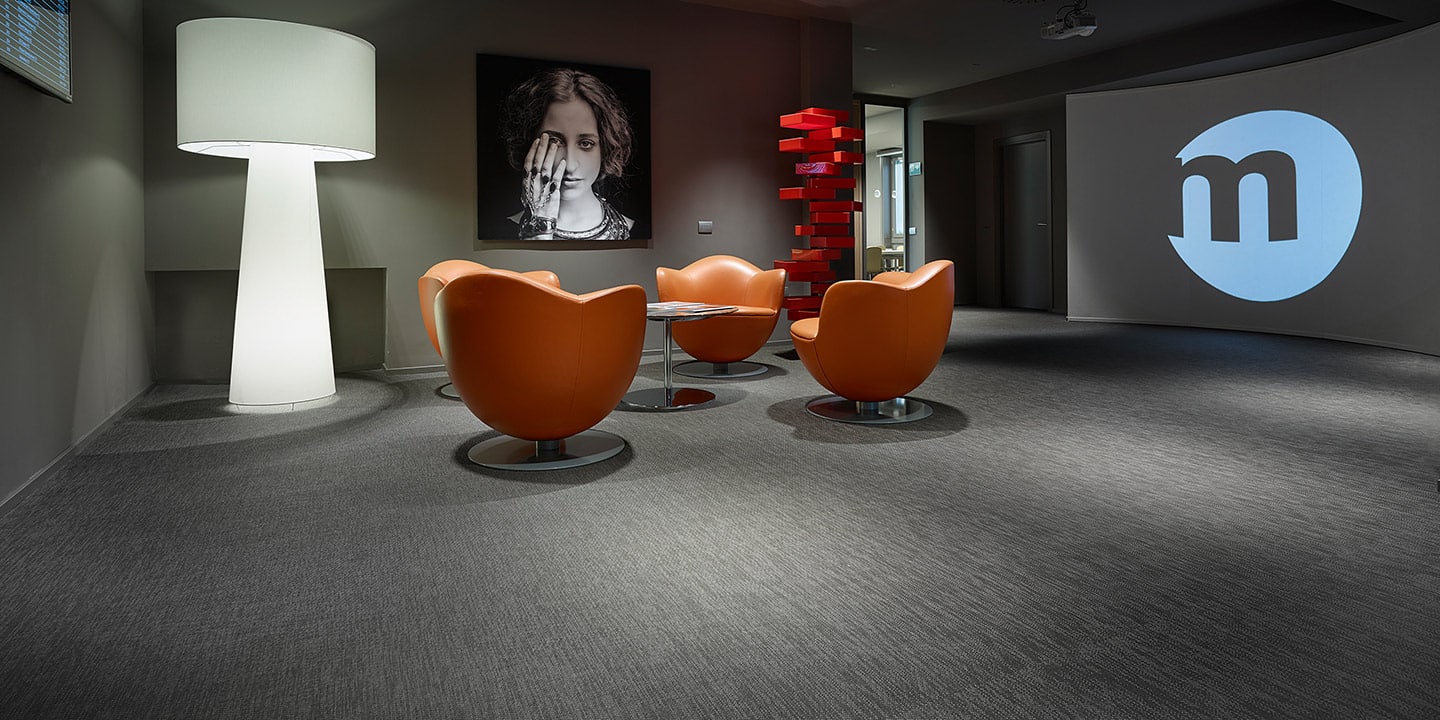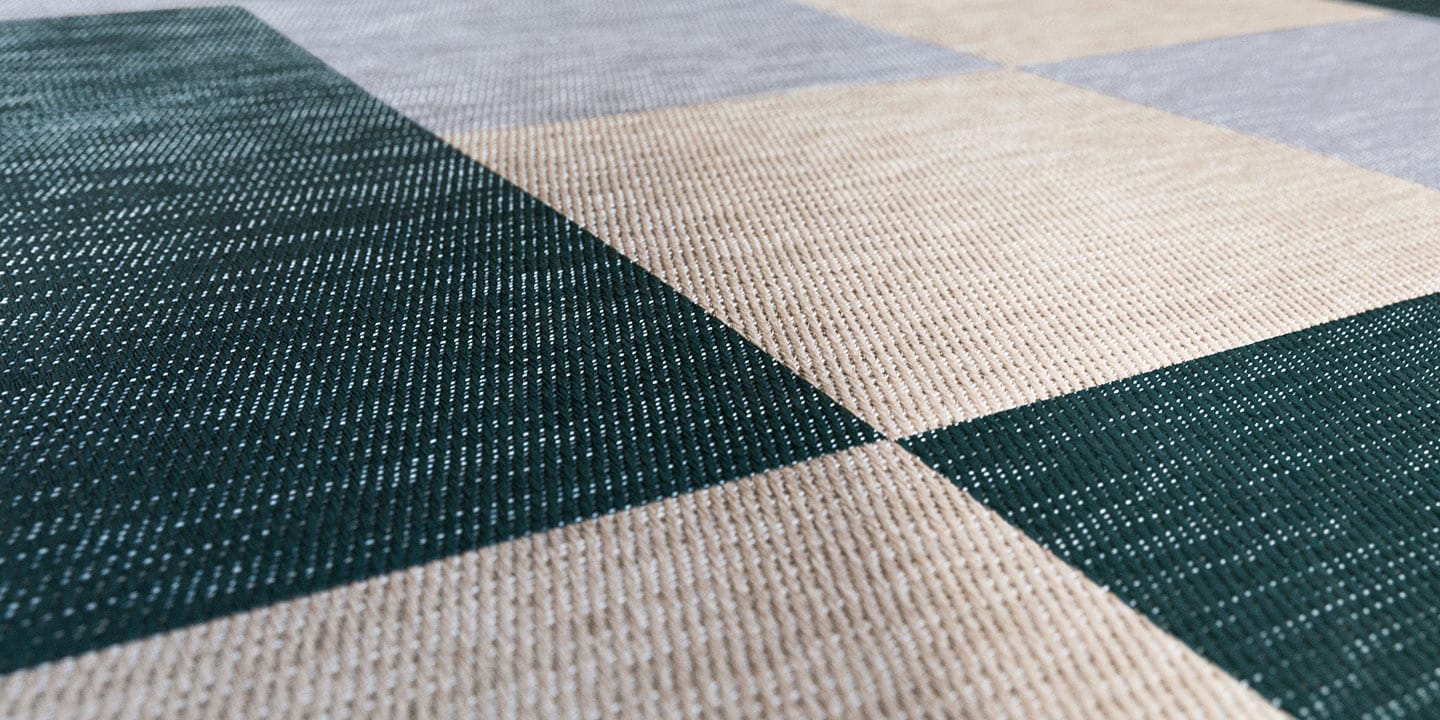 Tessuto vinilico ad effetto stuoia per pavimenti ad uso interno, con supporto in PVC e fibre di vetro. Filato opaco a sezione piatta e trama bicolore.