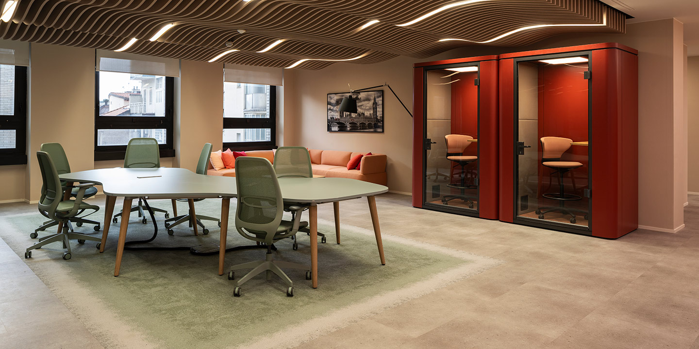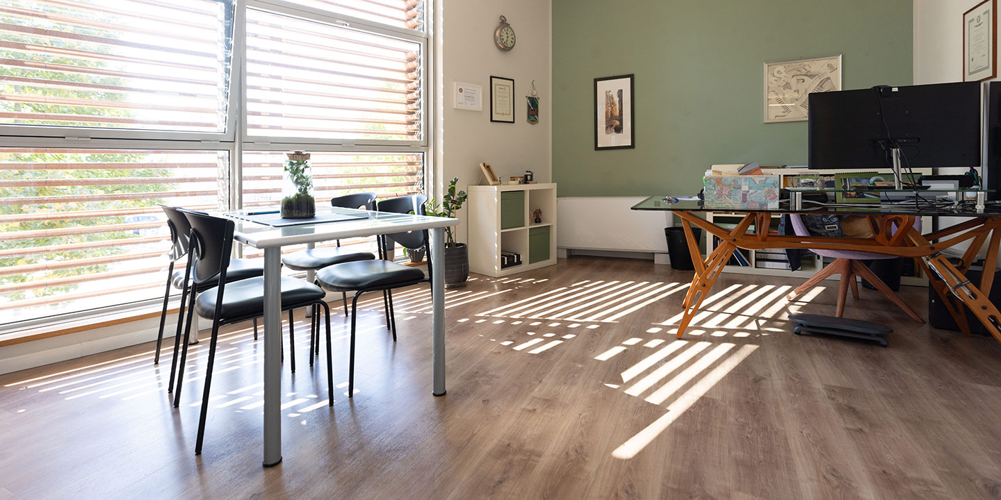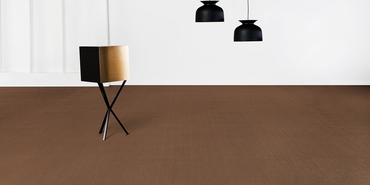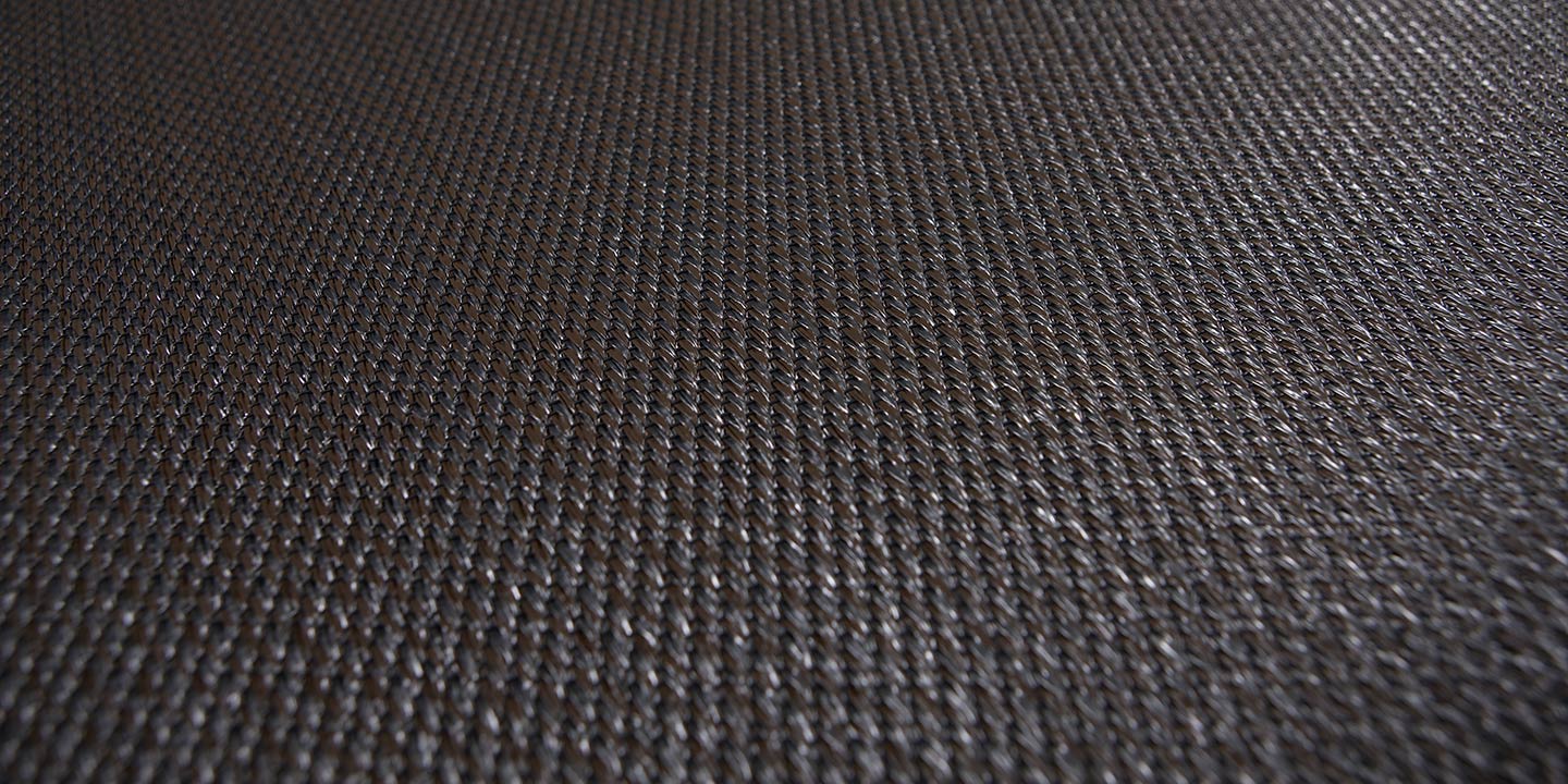 Tessuto vinilico ad effetto stuoia per pavimenti ad uso interno, con supporto in PVC e fibre di vetro. Filato a sezione piatta. Disegni bicolore spigati e tinta unita.