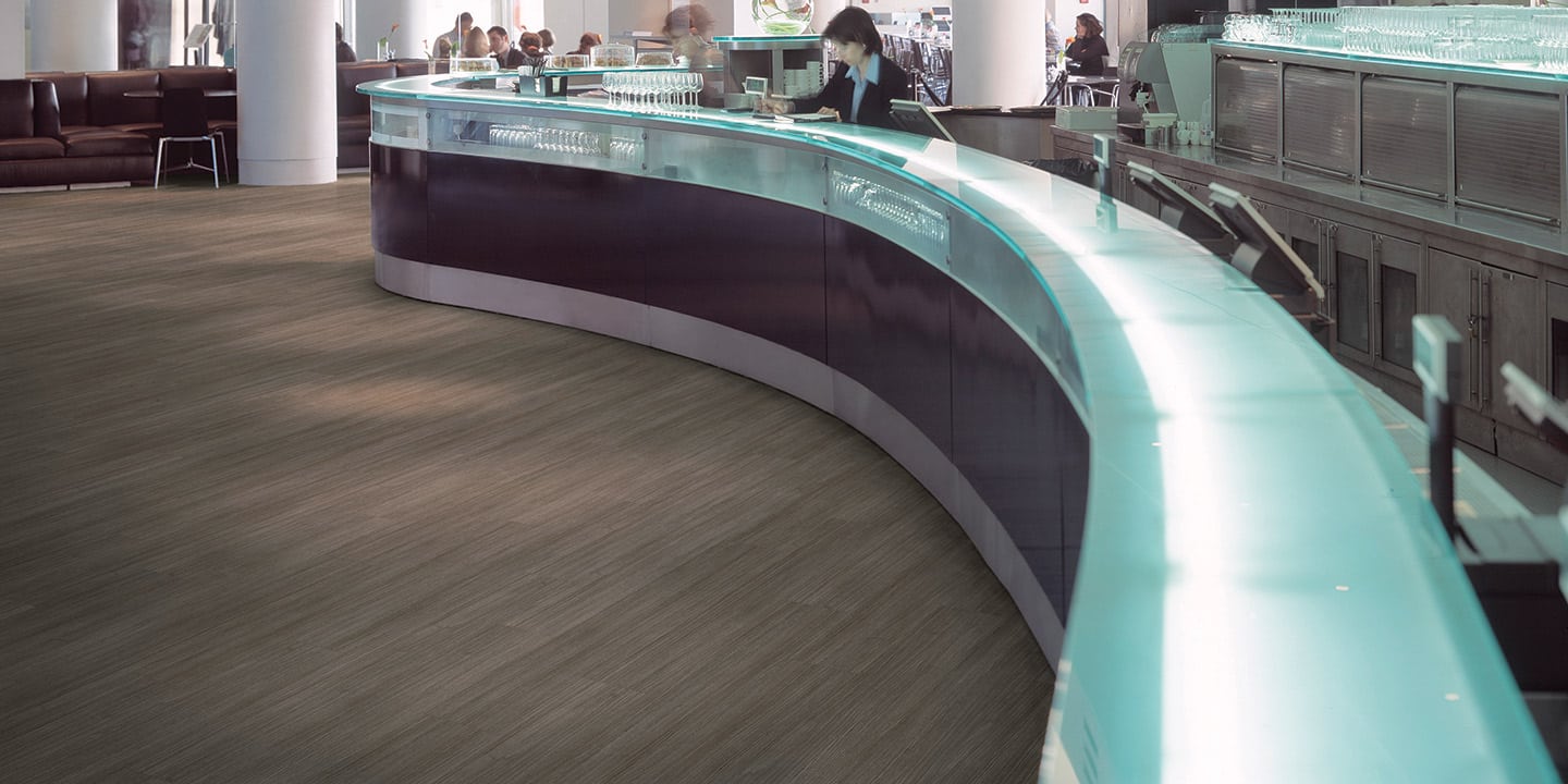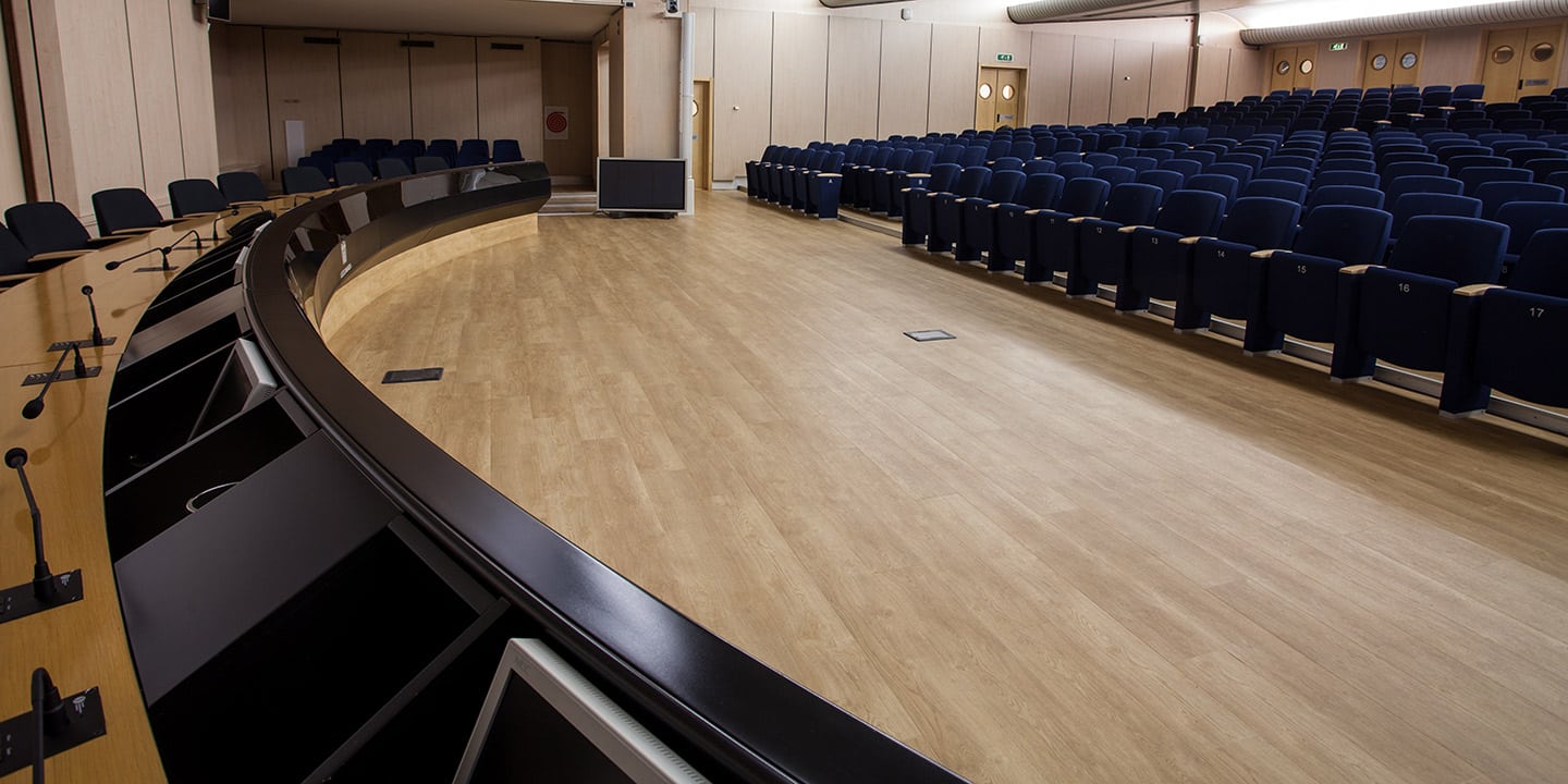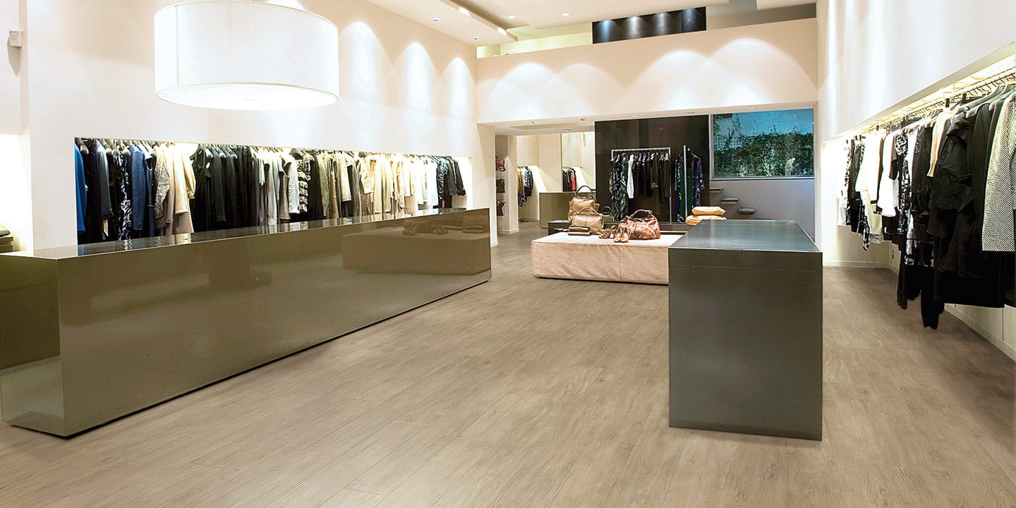 Pavimento vinilico “autoposante” in doghe bisellate, antistatico, stratificato, calandrato, superficie leggermente goffrata, stampato effetto legno. Trattamento poliuretanico rinforzato di superficie (PUR).