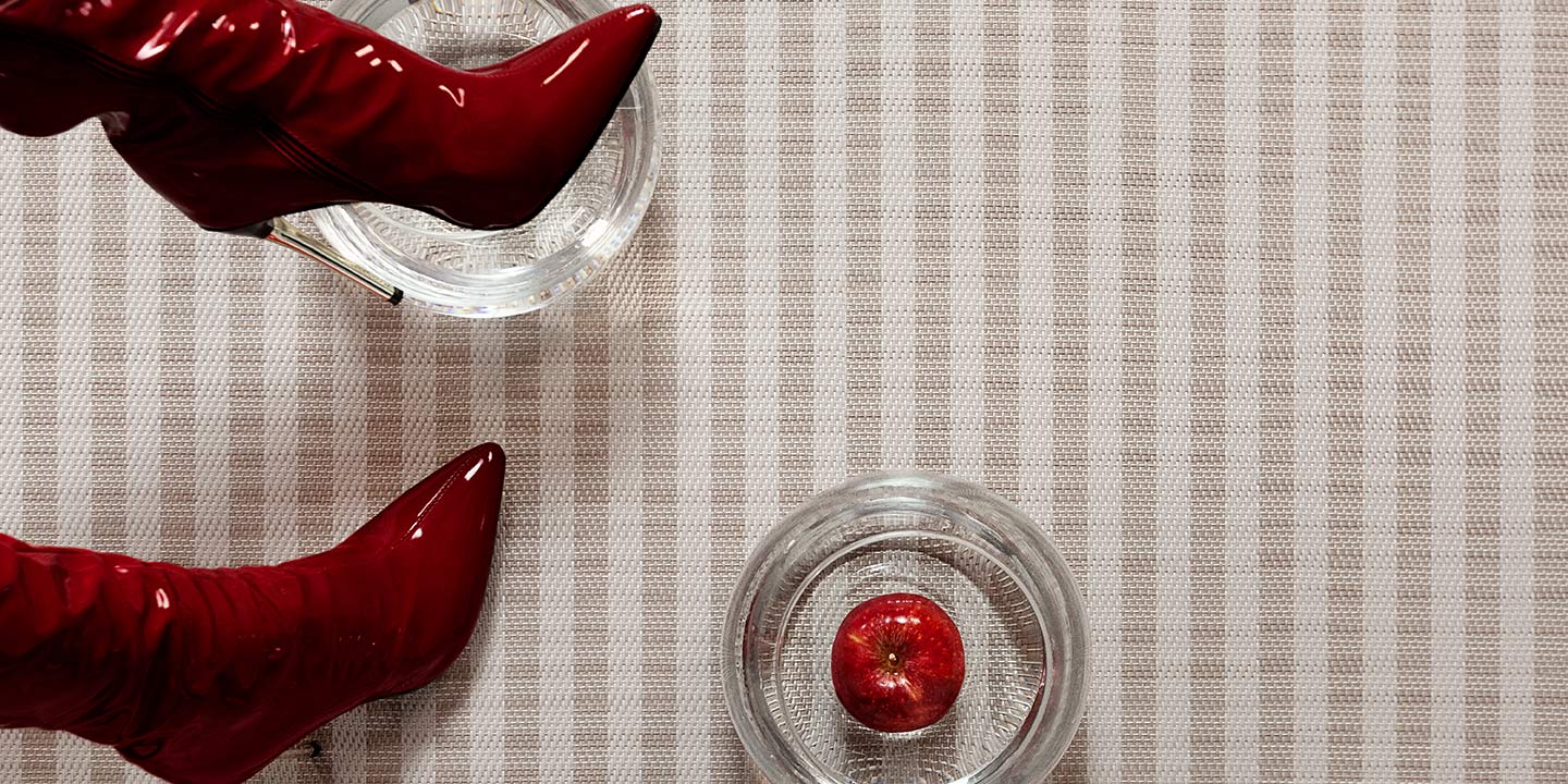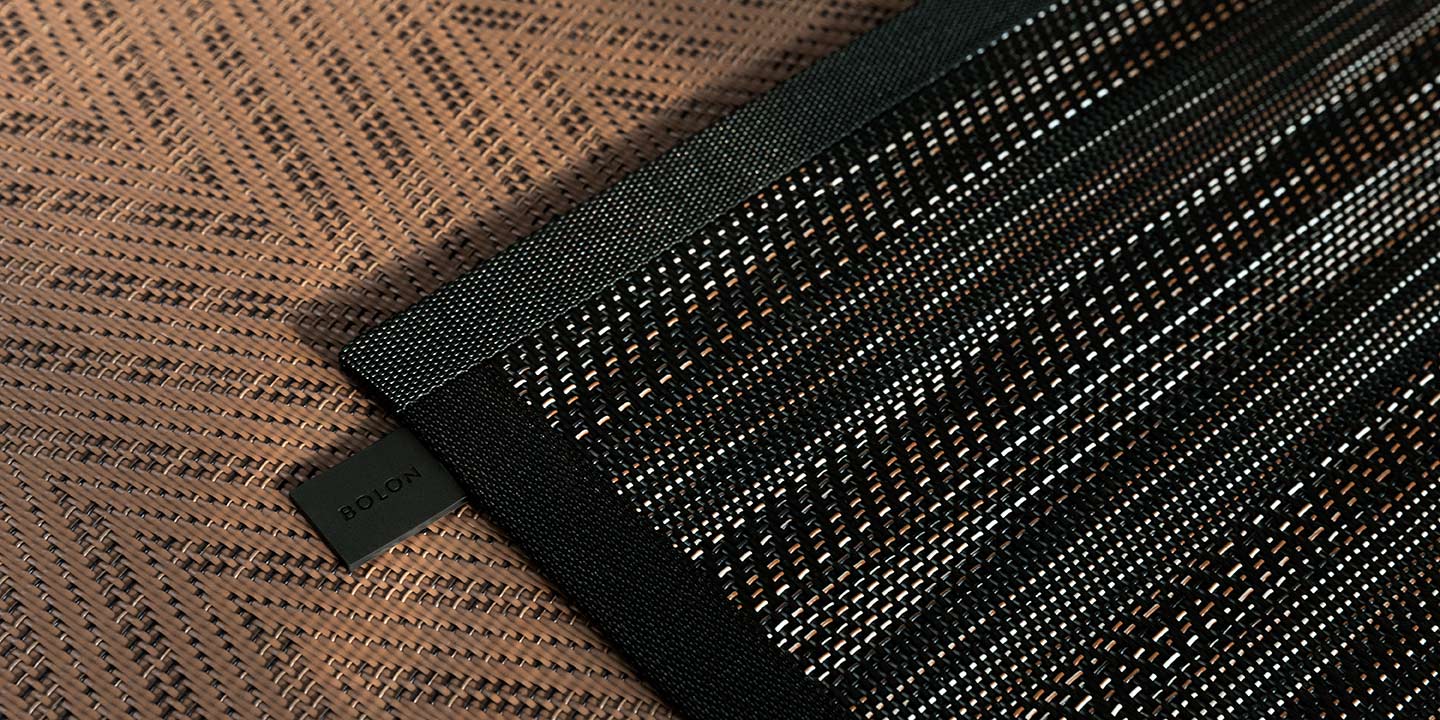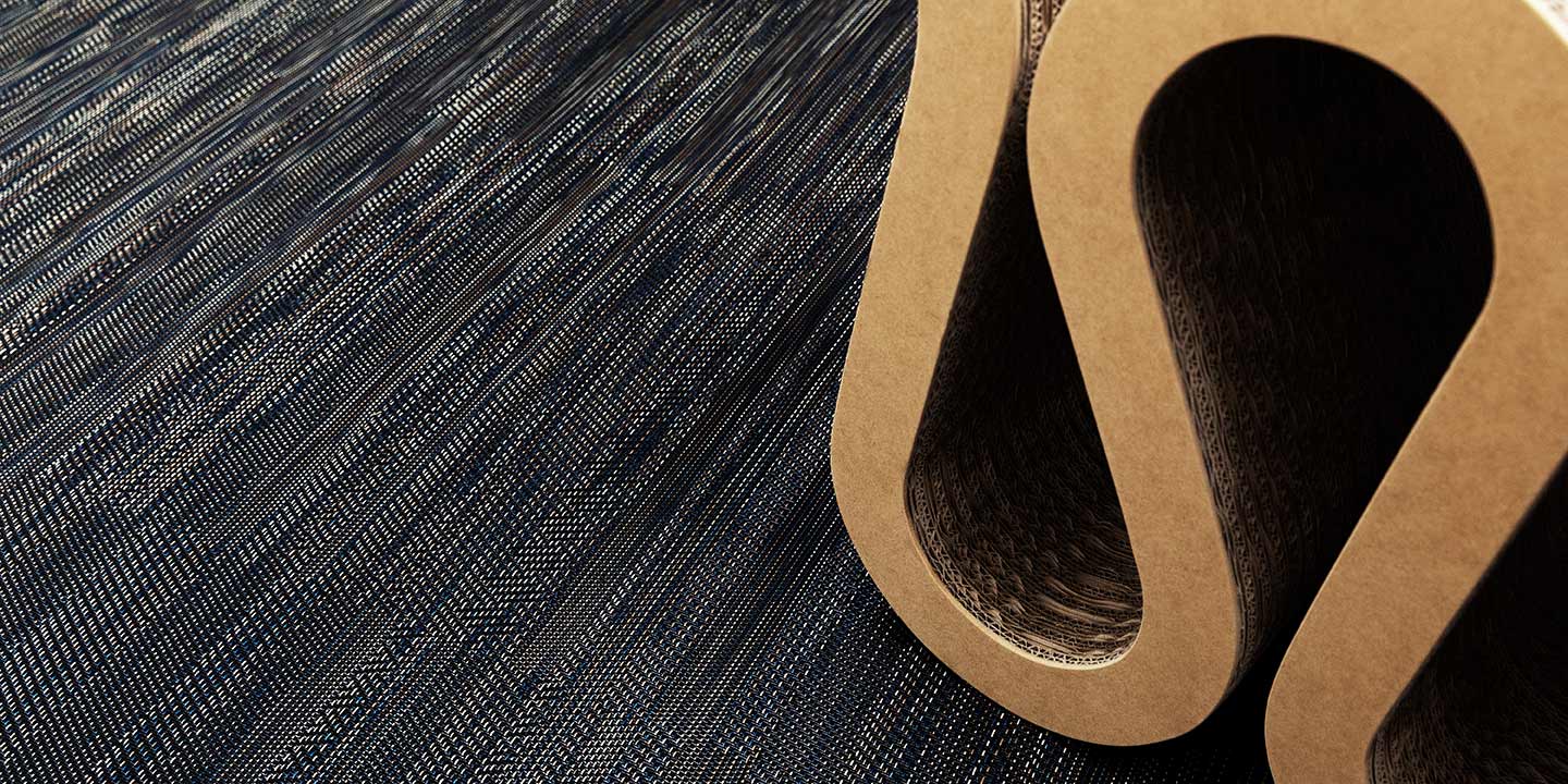 (+ un 5 strato opzionale per la versione acustica, costituito da materiale in feltro contenente PET da bottiglie riciclate, che aiuta ad attenuare l’impatto di suoni e rumori). Filato a sezione ellissoidale, ordito monocolore o rigato e trame alternate.