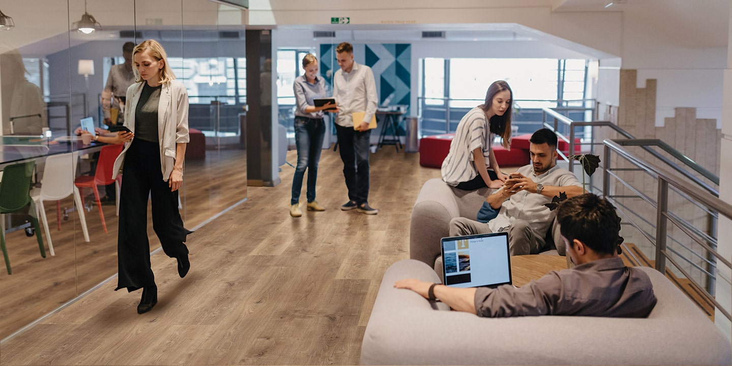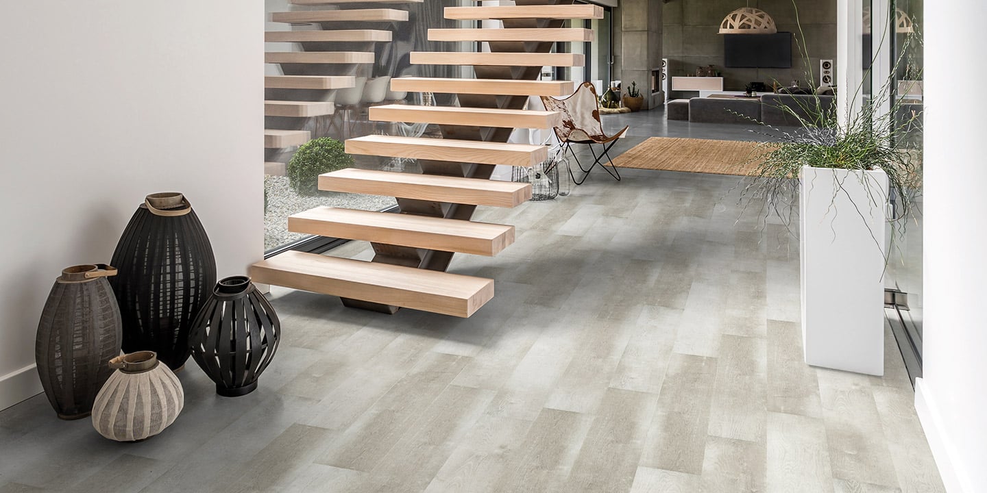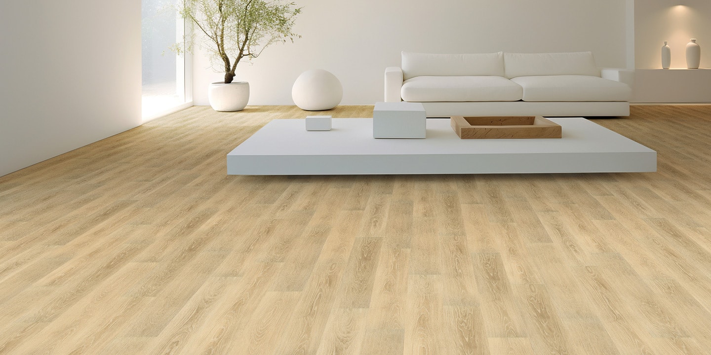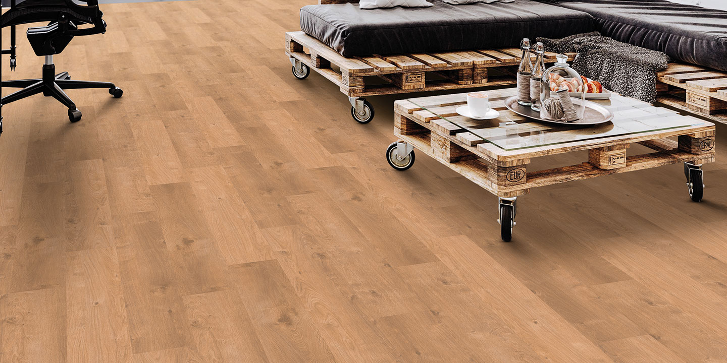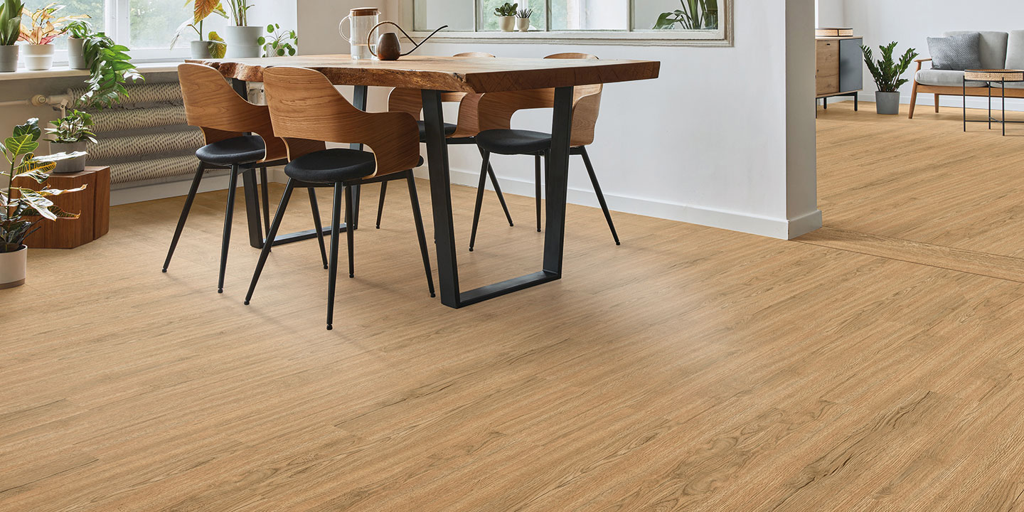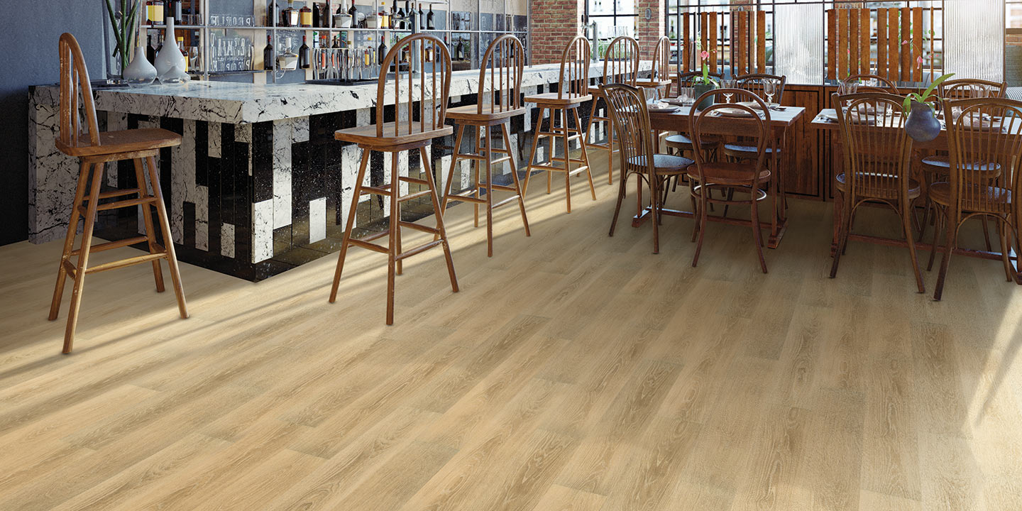 Rivestimento eterogeneo per pavimenti in PVC vergine al 100% in doghe. Lo strato di usura ha un trattamento PU per facilitarne la manutenzione.