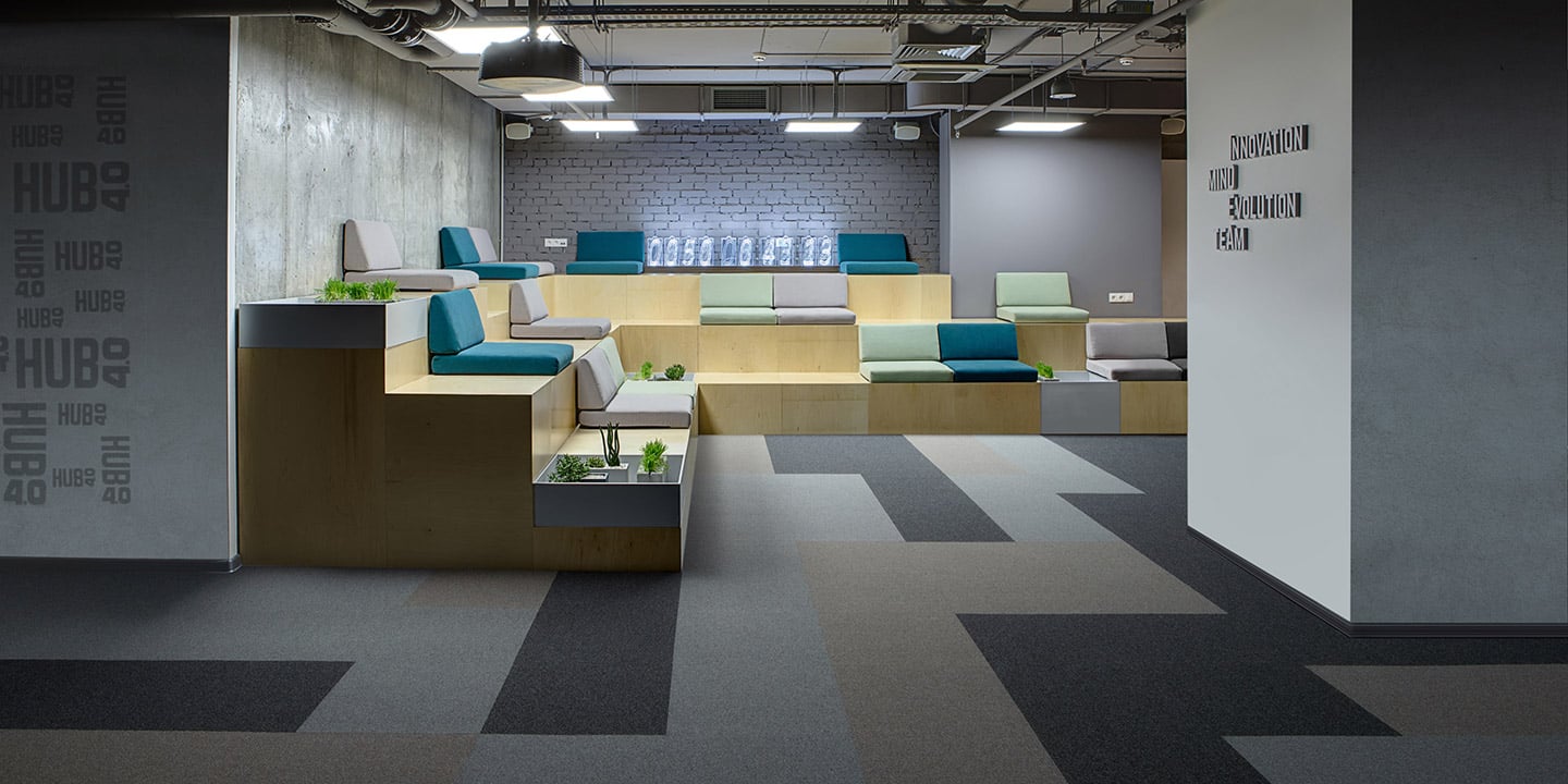 100% Filato Econyl®. 100% Solution Dyed Nylon rigenerato.  Bitume additivato con elastomeri termoplastici (10% materiale riciclato) rinforzato con fibra di vetro doppiata con 100% PES.