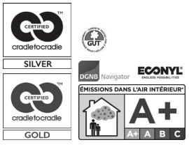 100% filato Econyl®; 100% Solution Dyed Nylon rigenerato. Sottofondo EcoBack: supporto a quadrotte completamente riciclabile a base di poliolefine con un minimo 75% di contenuto riciclato postindustriale.