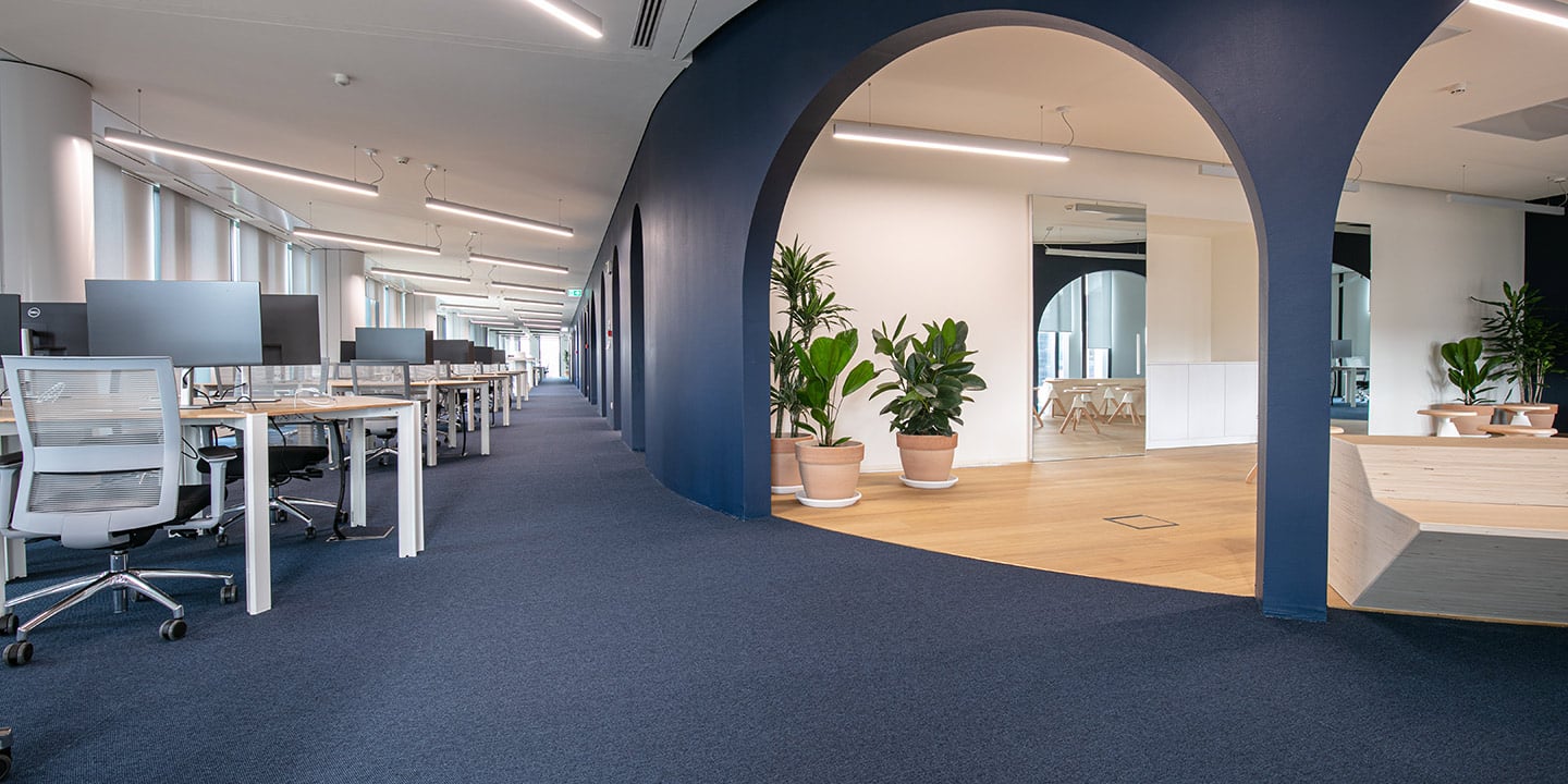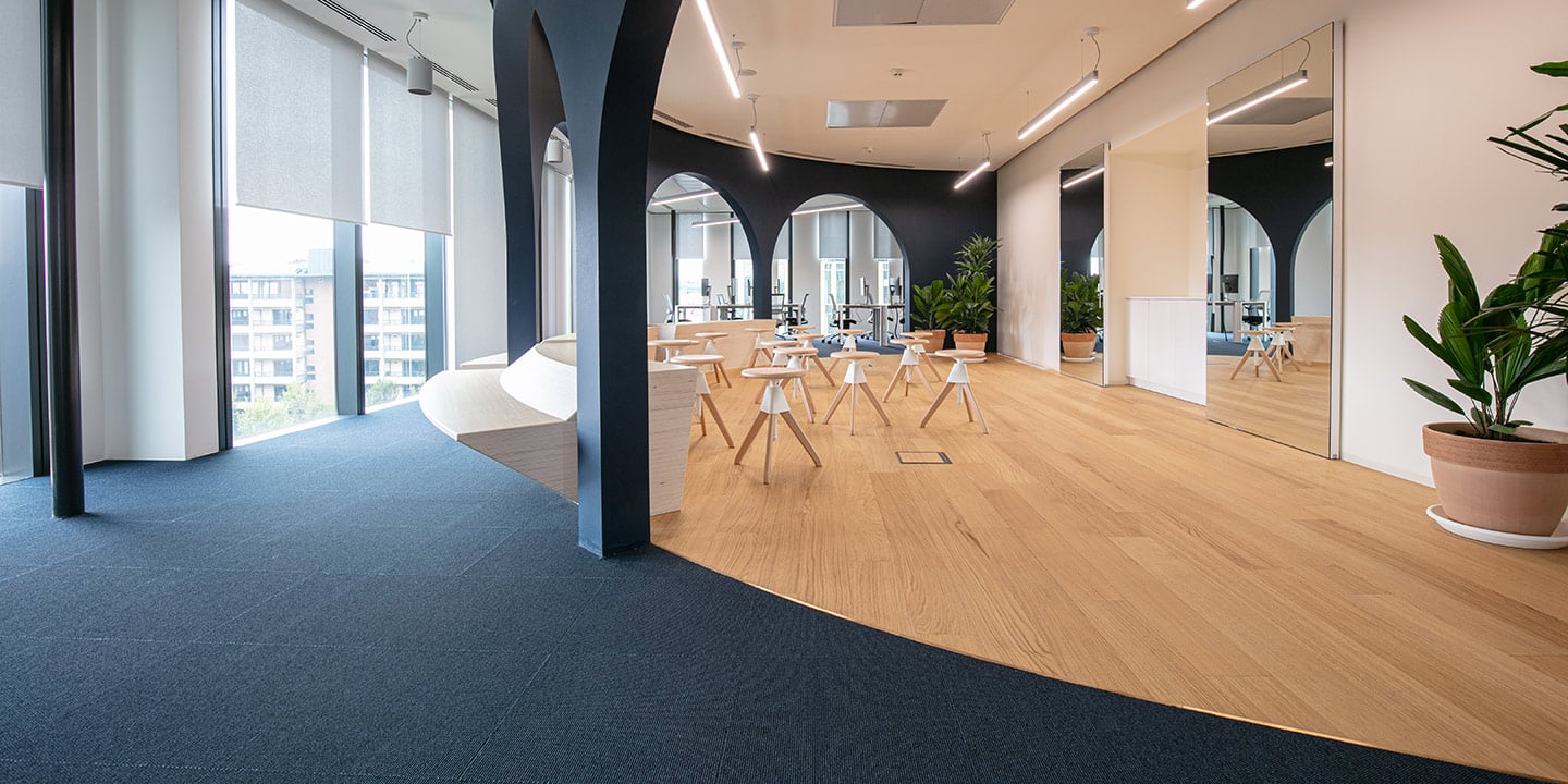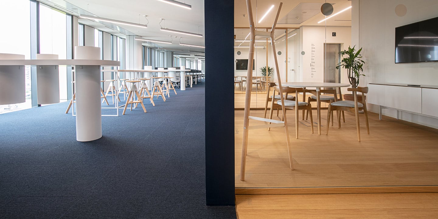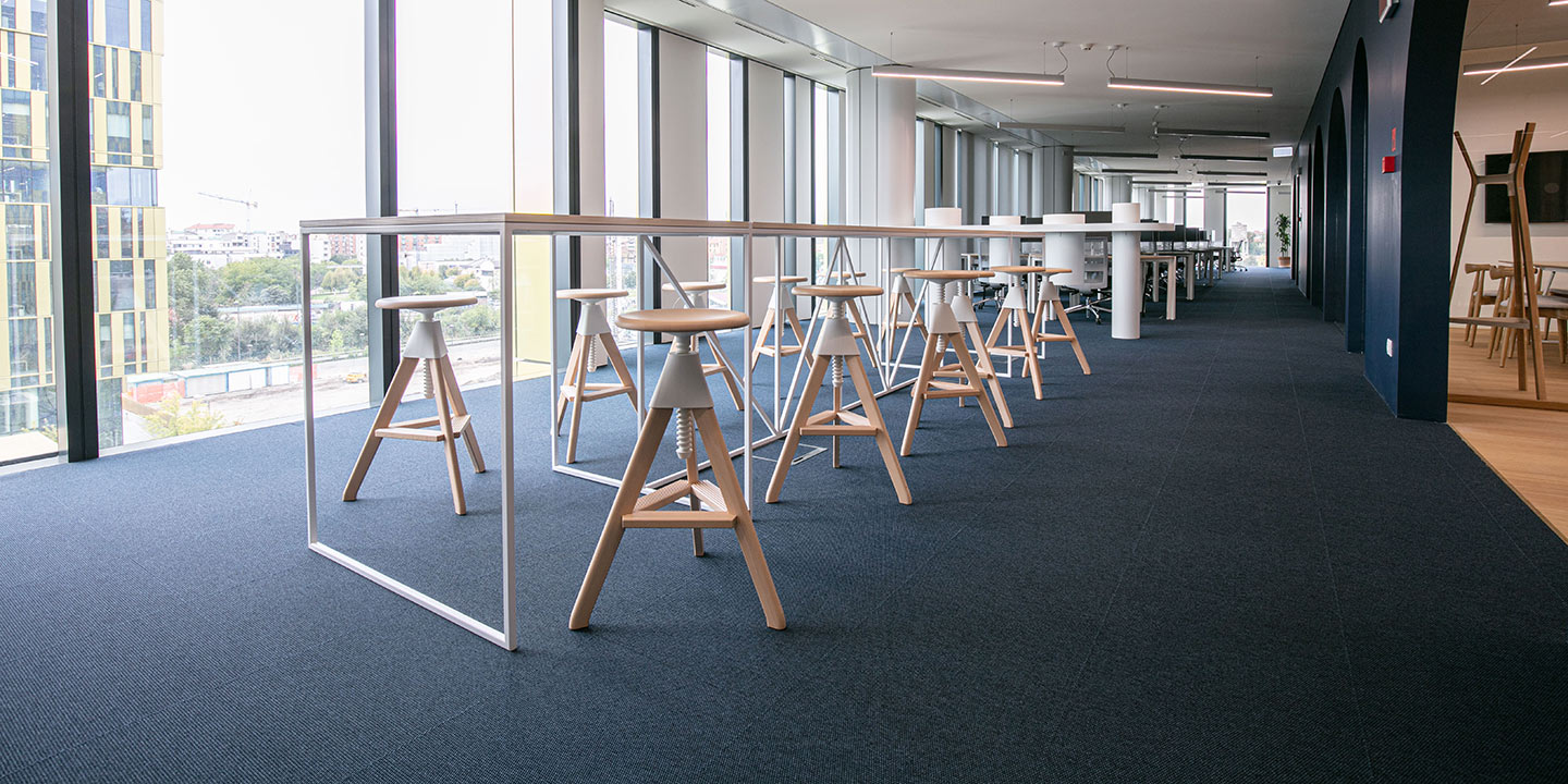 Moquette in quadrotte autoposanti tessute Flat Woven 100% Poliammide tinta in massa. Il taglio laser perimetrale ne evita lo sfilacciamento ed il trattamento Teflon ne facilita la manutenzione.