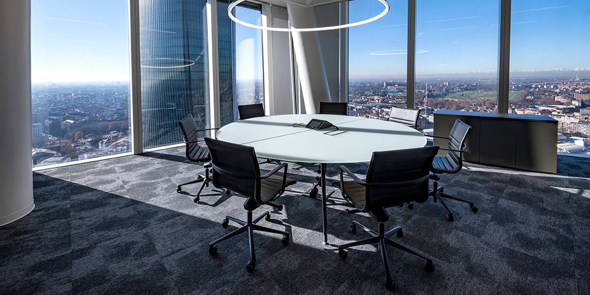 Moquette in quadrotte autoposanti tessute Flat Woven 100% Poliammide tinta in massa. Il taglio laser perimetrale ne evita lo sfilacciamento ed il trattamento Teflon ne facilita la manutenzione.