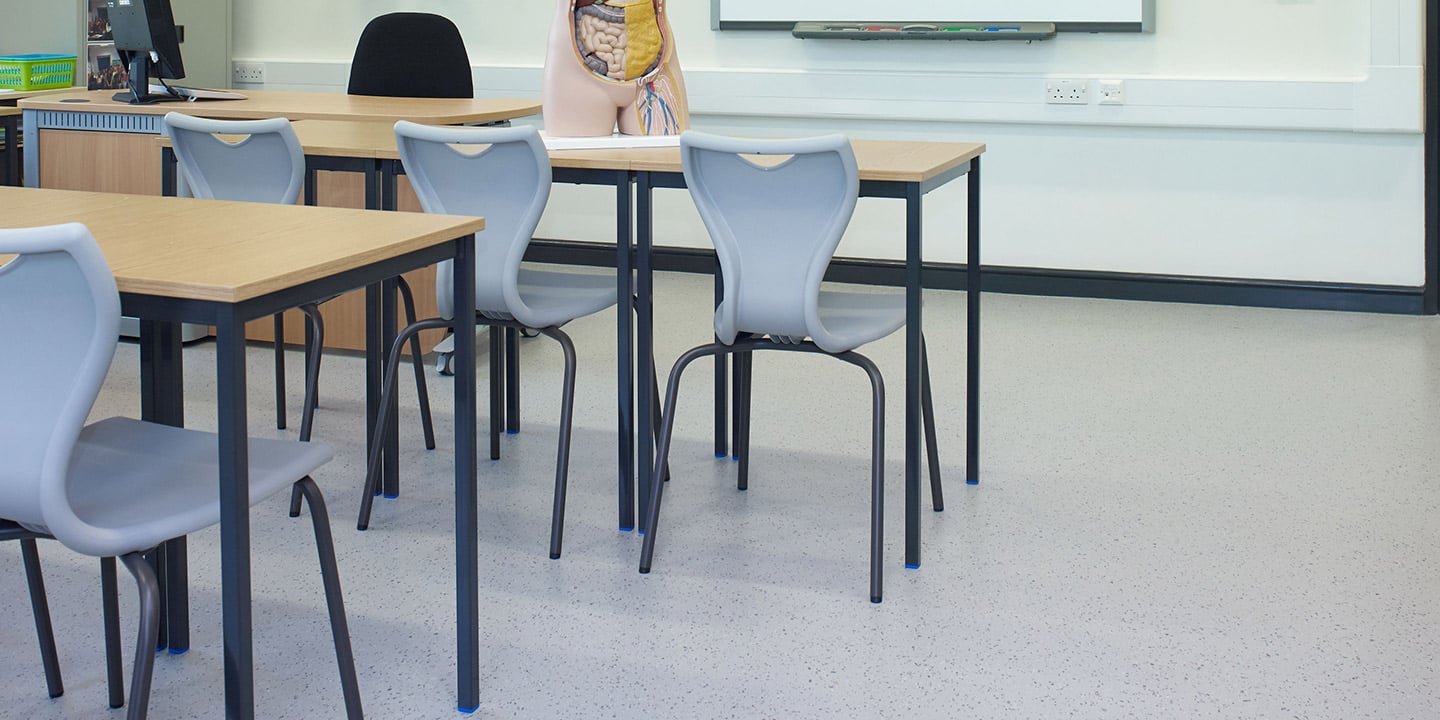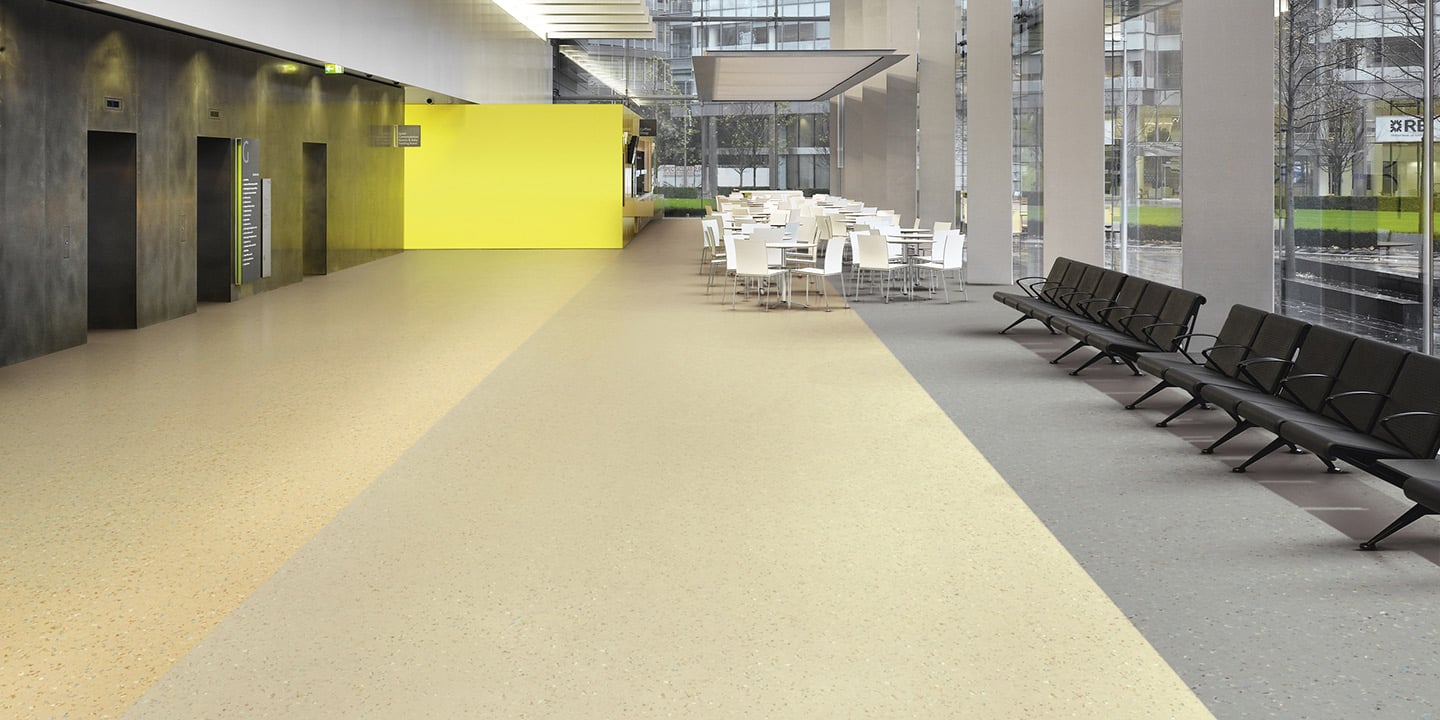 Pavimenti vinilici ad altissima resistenza, antistatici, omogenei, presso-calandrati, flessibili, saldabili, superficie liscia poliuretanata, disegno non direzionale, multicolore. Gruppo d’abrasione T.