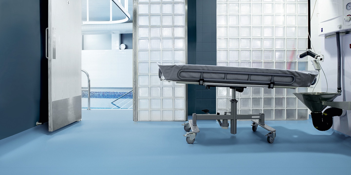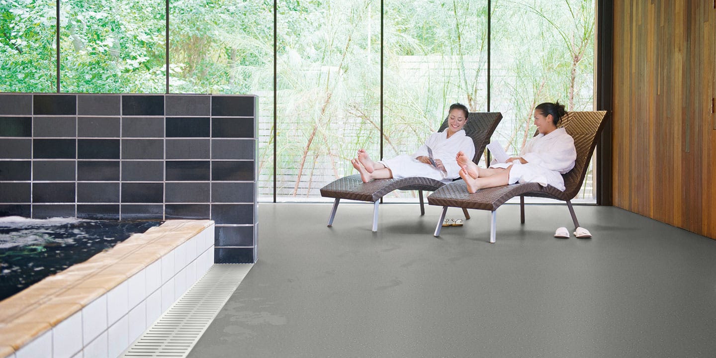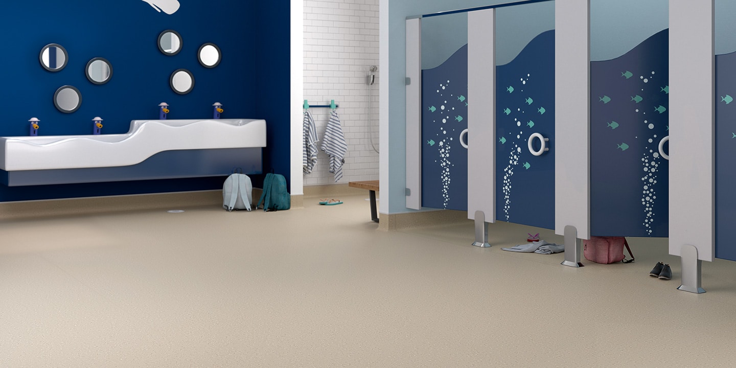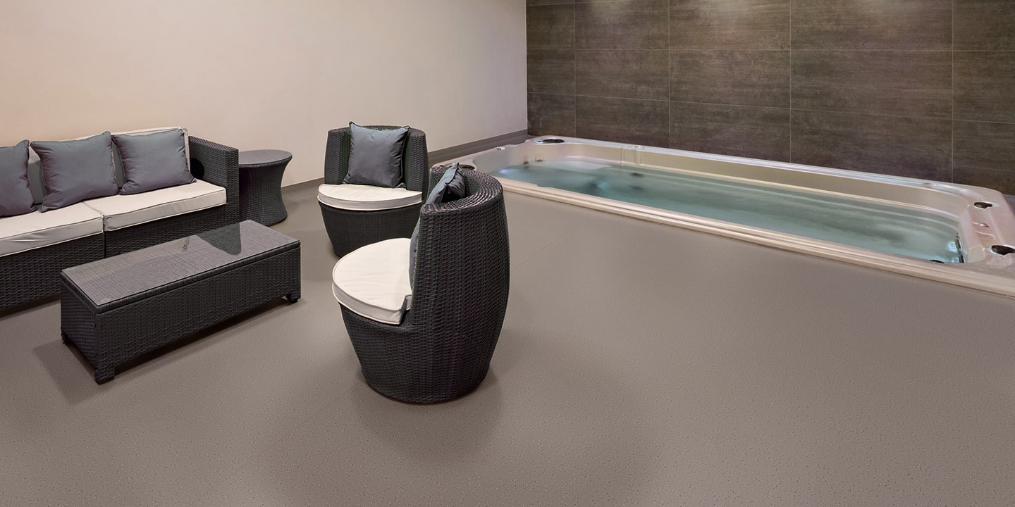 Pavimento vinilico spalmato, antiscivolo, antistatico, antibatterico, flessibile, saldabile, aspetto puntinato, multicolore, superficie goffrata. Progettato specificamente per aree costantemente bagnate, sia per l’uso a piedi nudi che con calzature.