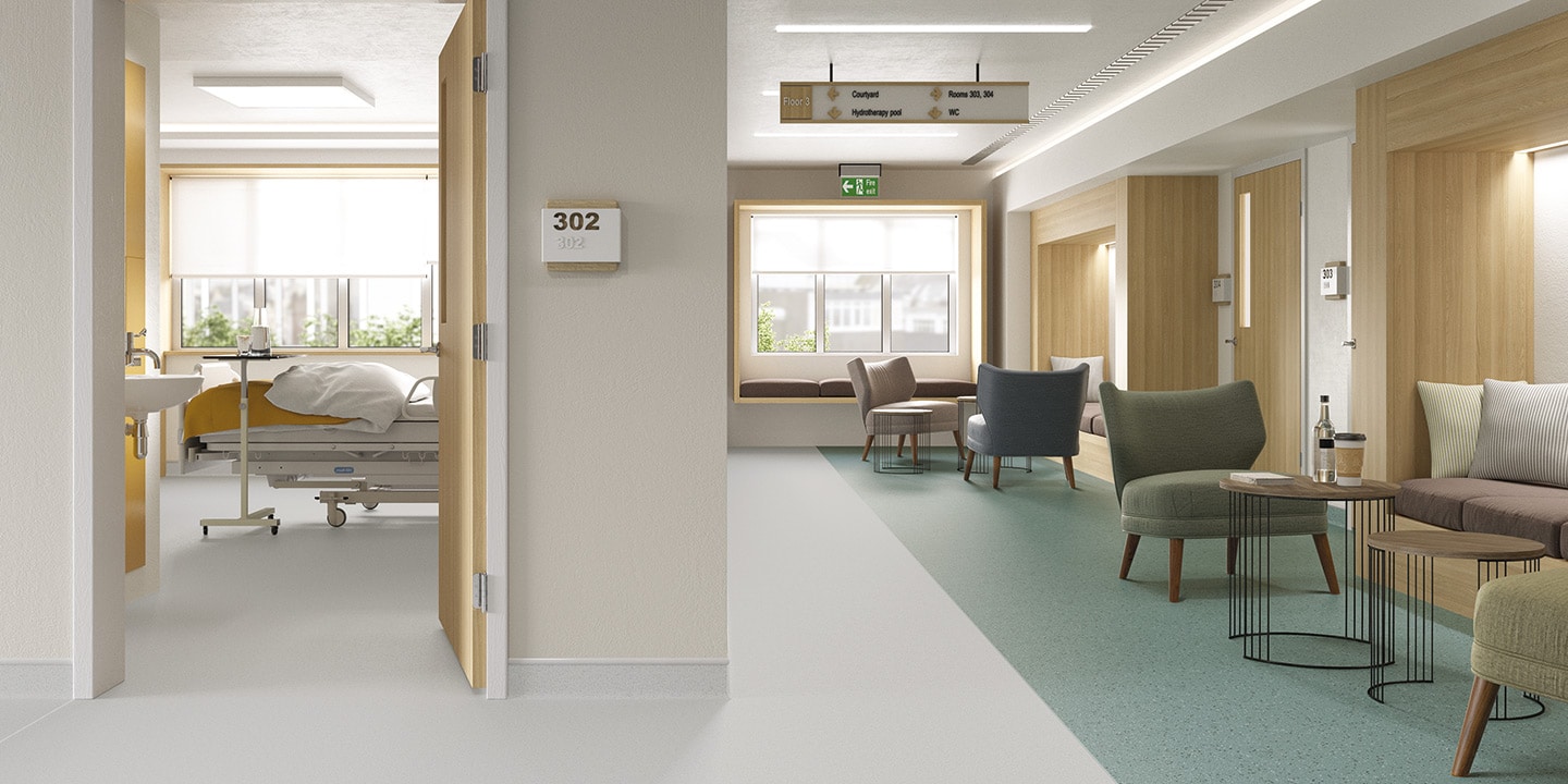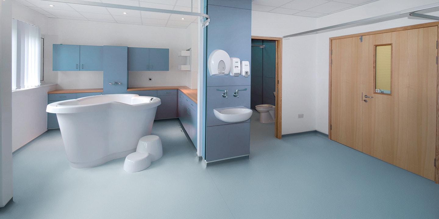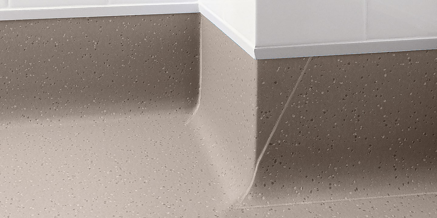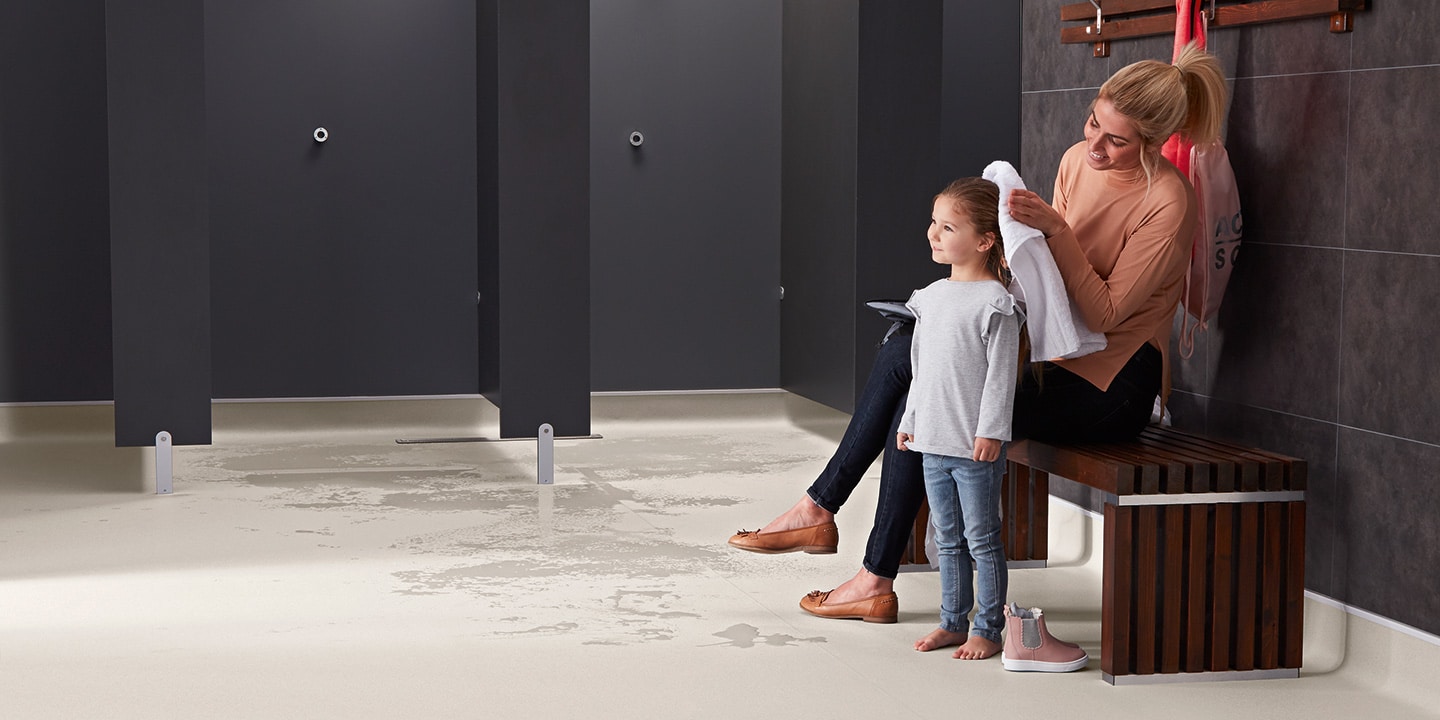 Pavimento vinilico spalmato, antiscivolo, antistatico, antibatterico, flessibile, saldabile, aspetto puntinato, multicolore, superficie goffrata. Progettato specificamente per aree costantemente bagnate, sia per l’uso a piedi nudi che con calzature.