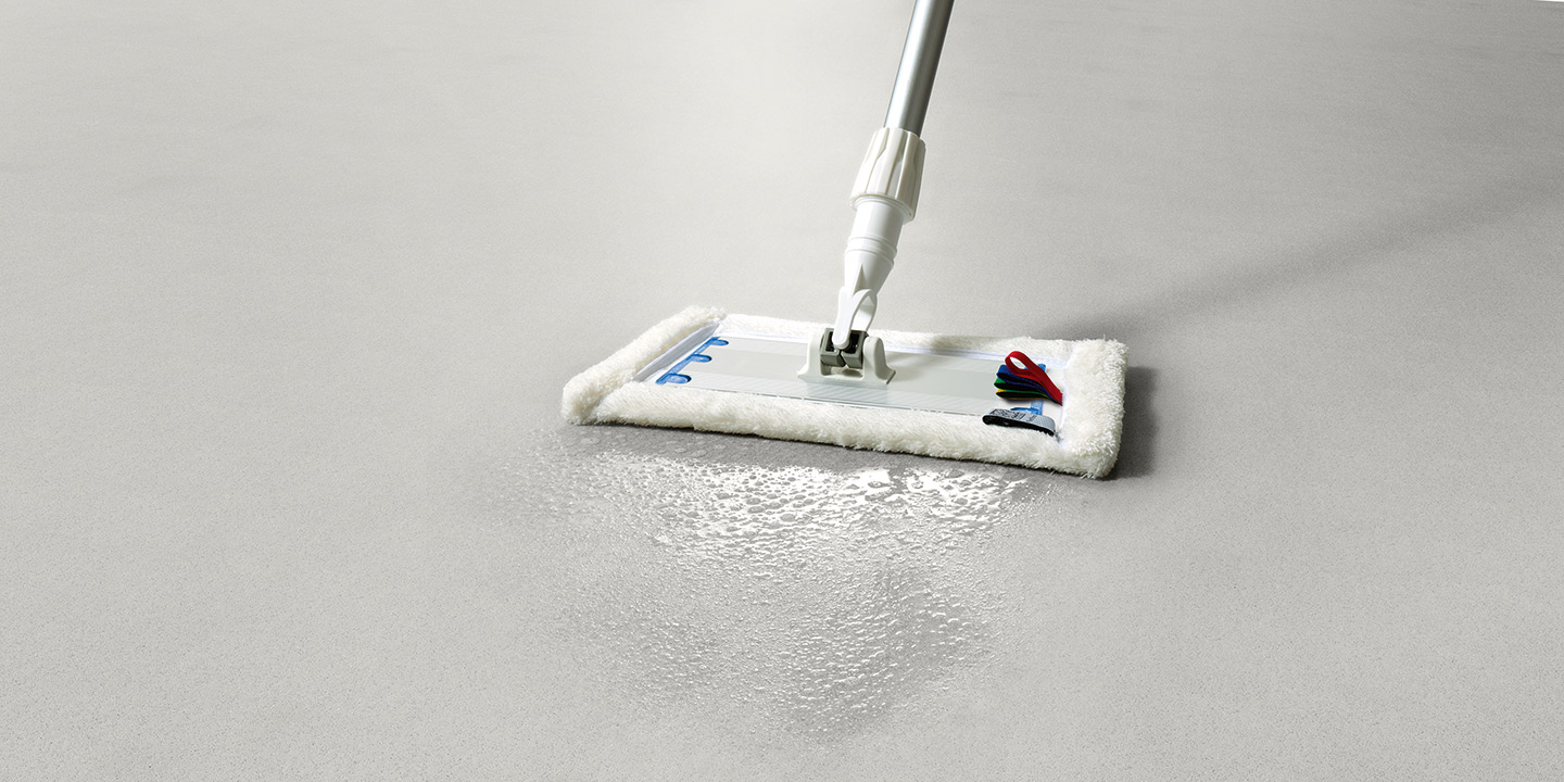 Particelle di quarzo colorato e aggregati naturali riciclati, incorporati nel vinile. Trattamento poliuretanico rinforzato di superficie.