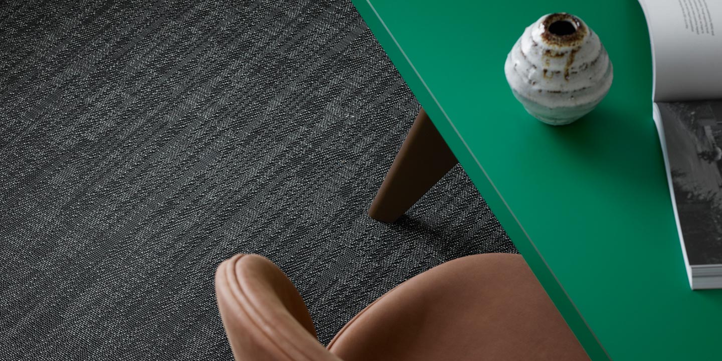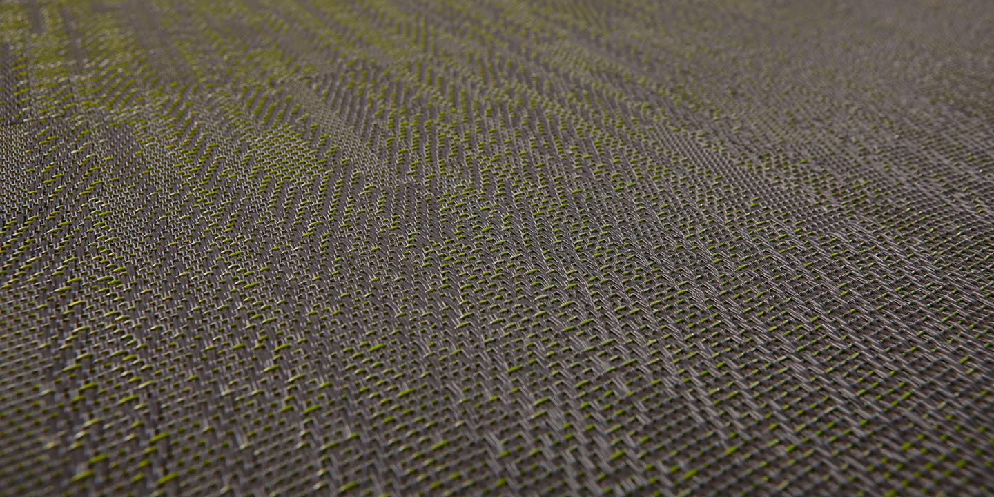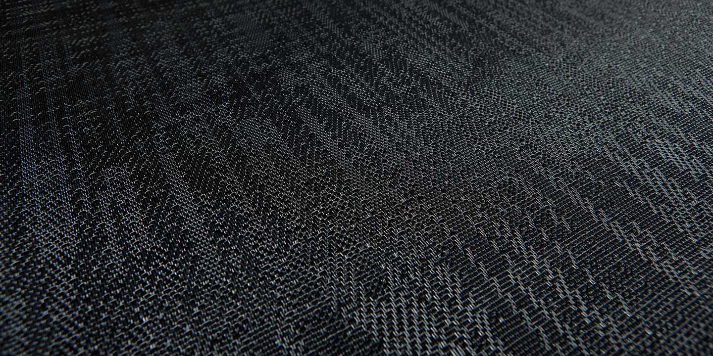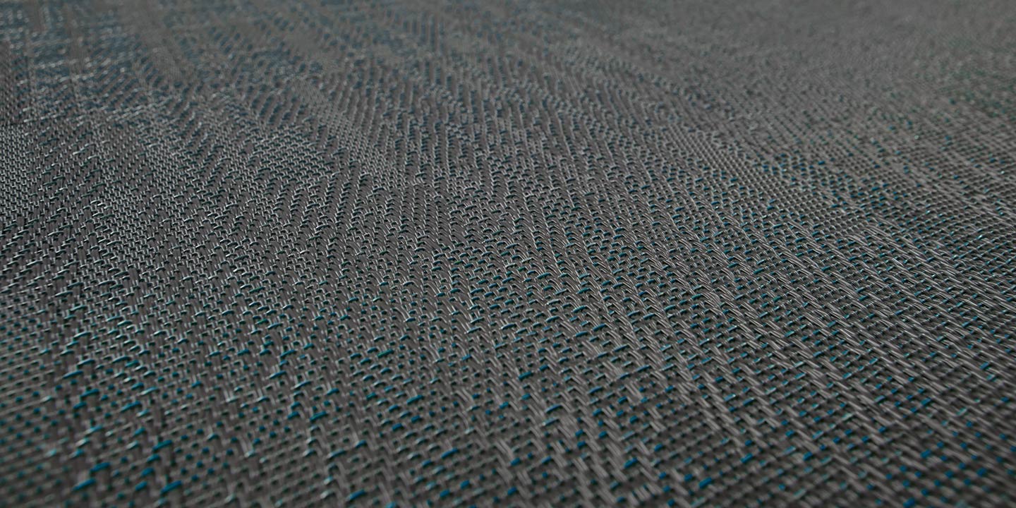 (+ un 5 strato opzionale per la versione acustica, costituito da materiale in feltro contenente PET da bottiglie riciclate, che aiuta ad attenuare l’impatto di suoni e rumori). Filato a sezione a “S”, trama bicolore, tessitura jacquard random.