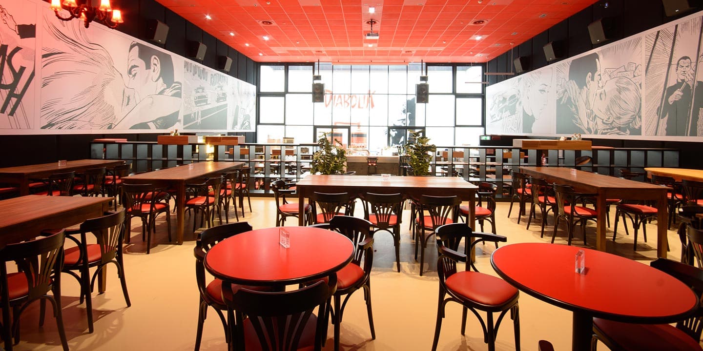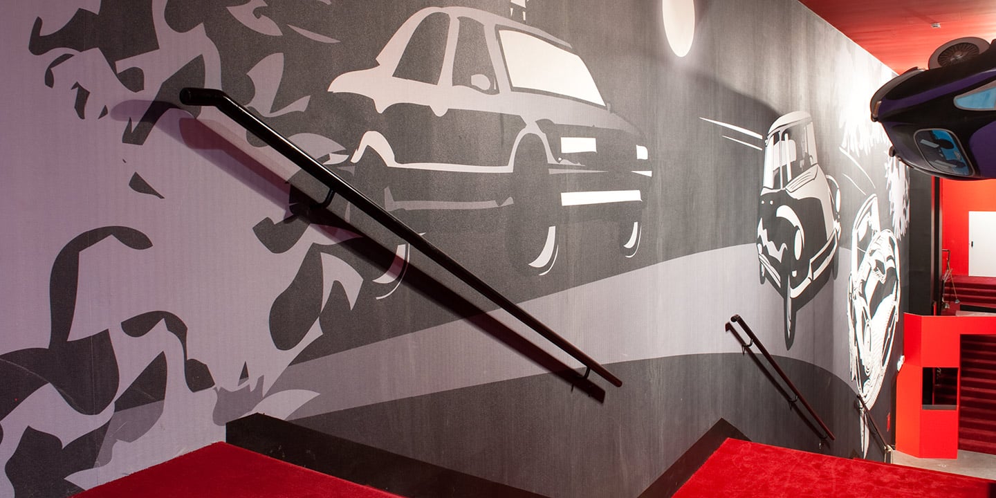 mq. 308 Esadur Plain, mq. 20 Module In-groove, mq. 120 Suwide Scala con stampa personalizzata.