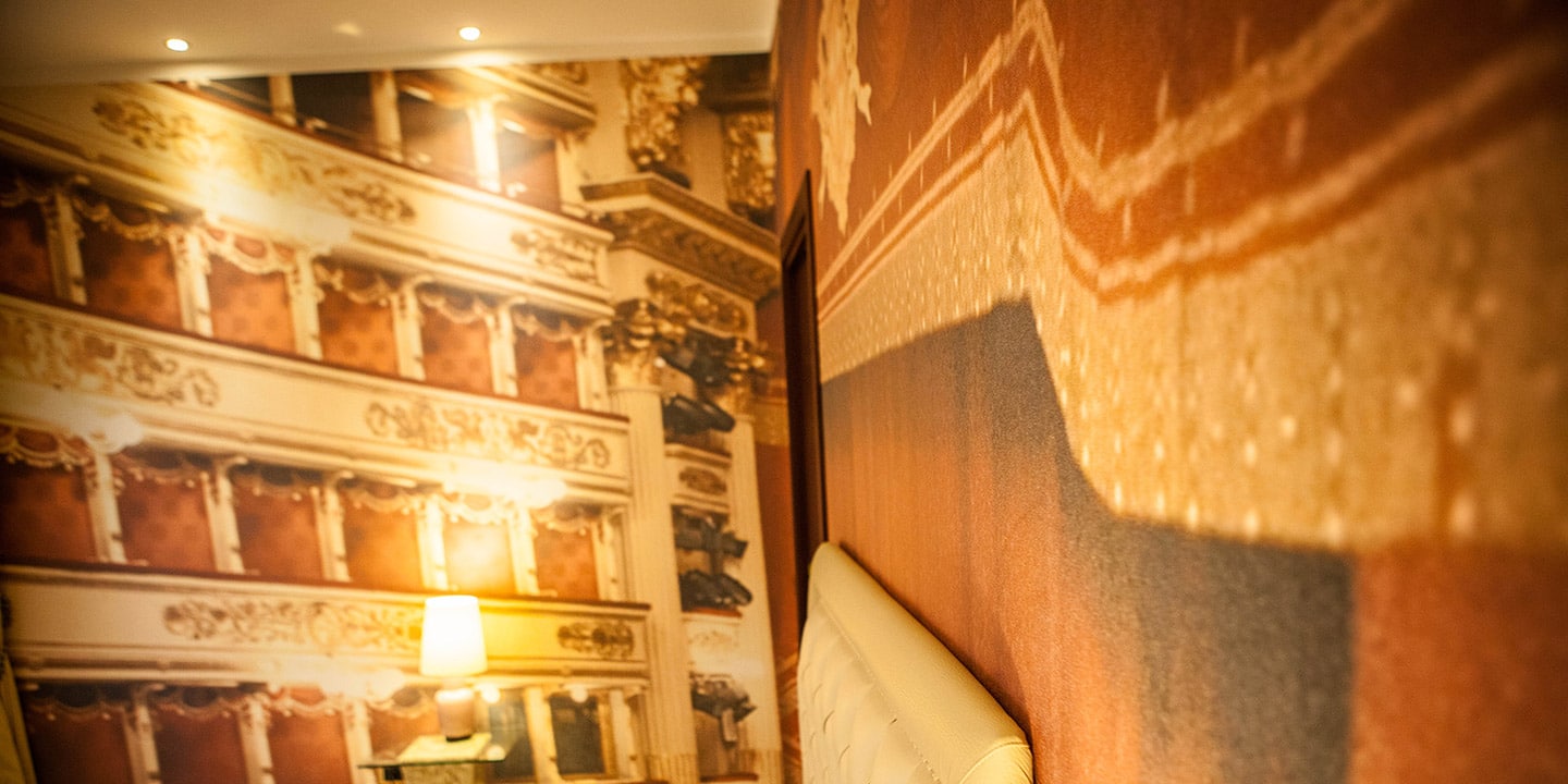 Pareti: Rivestimenti Suwide personalizzati con stampa a tema: palchi e foyer del Teatro La Scala di Milano.