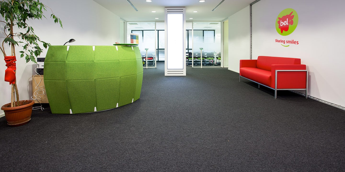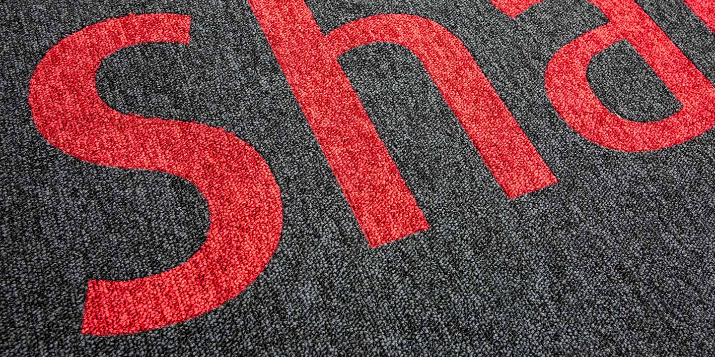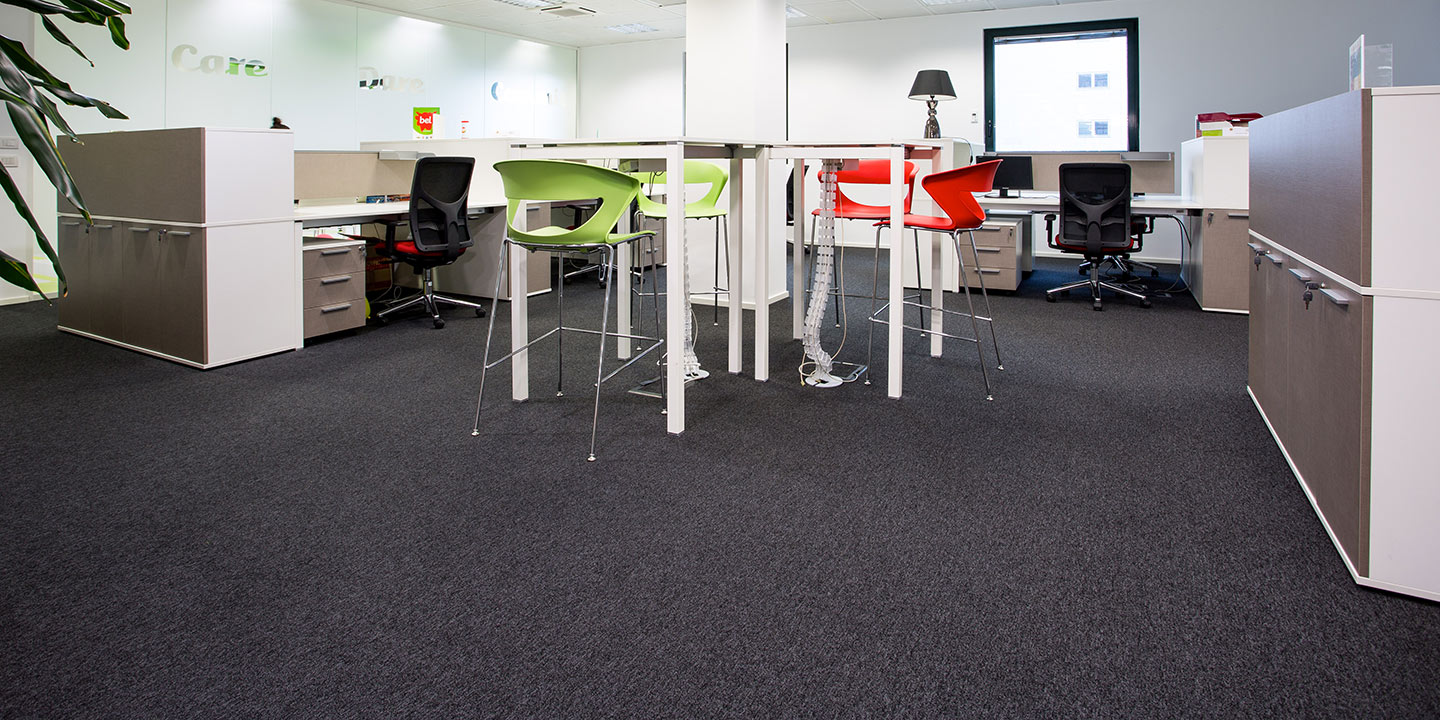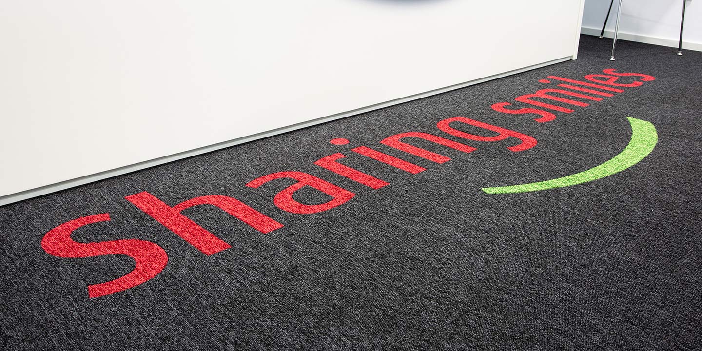 mq. 72 di S608 Fractile col. 622 – 625 – 626, mq. 650 moquettes in quadrotte autoposanti First col. 990 con inserti di Step col. 60 F e 30 F per la creazione del logo “Sharing Smiles”