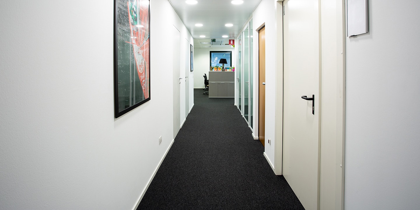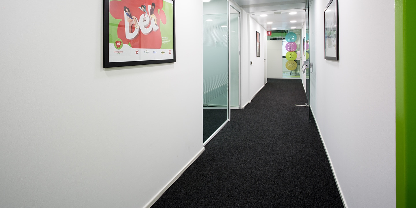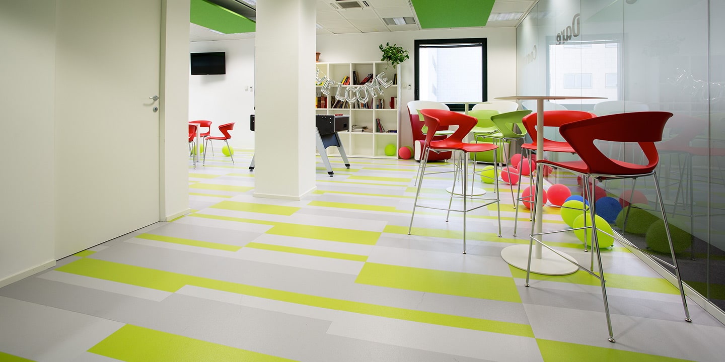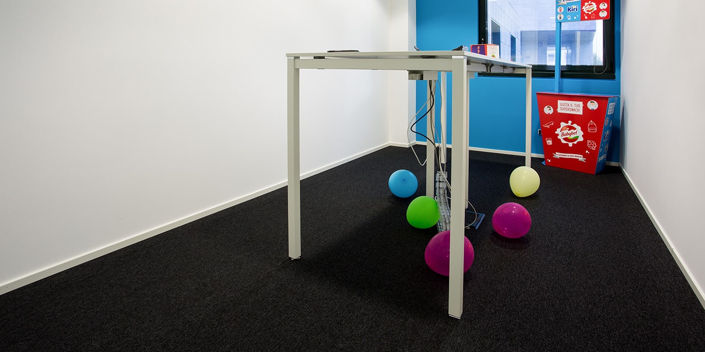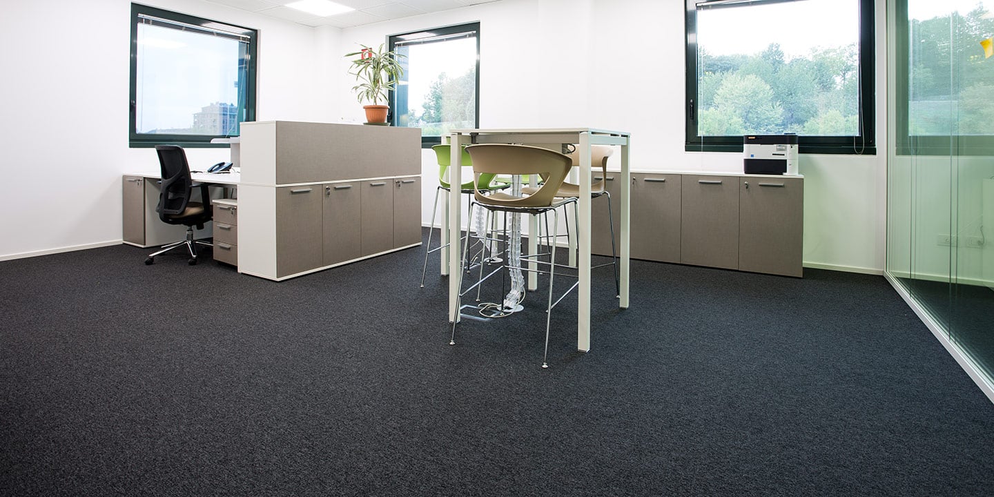 mq. 72 di S608 Fractile col. 622 – 625 – 626, mq. 650 moquettes in quadrotte autoposanti First col. 990 con inserti di Step col. 60 F e 30 F per la creazione del logo “Sharing Smiles”