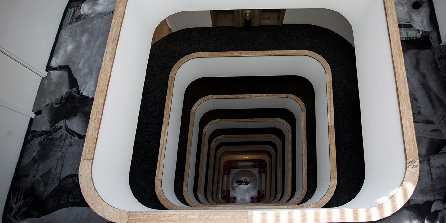 Corridoi e sbarchi ascensore: mq. 500 Moquette Studio Hotel AP 1050 personalizzata su disegno dell’Arch. Simone Micheli, raffigurante la Fontana dei Quattro Fiumi di P.zza Navona, opera di Gian Lorenzo Bernini.